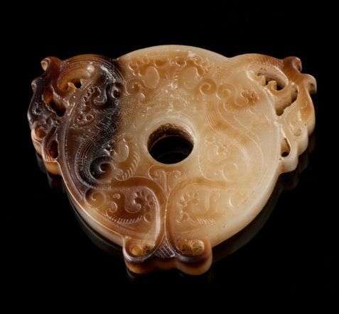 Plaquette circulaire en jade vert tacheté de rouille et de brun sculpté de chimères et taotie dans le style archaïque. 20ème siècle Diam.: 5 cm
