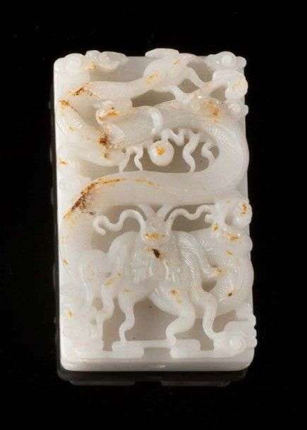 Plaquette rectangulaire en jade blanc-gris avec traces de rouille, sculptée sur une face d'un idéogramme ajouré de fleurs de lotus. Sur l'autre face un dragon à la recherche de la perle sacrée entouré de nuages. Deuxième moitié du 19ème siècle Dim.: 8.5 x 5 cm