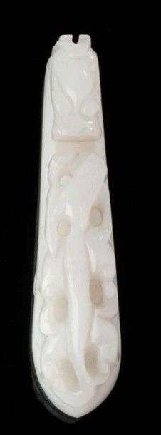 Agrafe Daïku en jade blanc sculptée en relief de deux chimères opposées. Début du 20ème siècle Long.: 9,5 cm