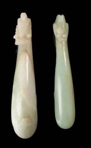 Deux agrafes daïku en jade vert clair avec trace de rouille sur l'une. Première moitié du 20ème siècle Long.: 9 et 10 cm