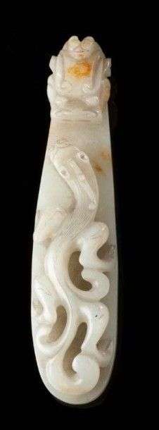 Figure daïku en jade vert clair avec trace de rouille face à une chimère. Début du 20ème siècle Long.: 10.5 cm