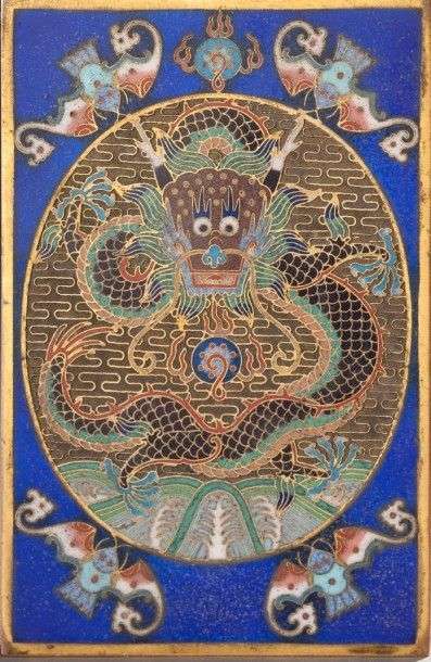 Bel objet de lettré à poser en bronze doré décoré en cloisonné d'un dragon pentadactyle devant la perle sacrée. 19ème siècle Dim.: 1.7 x 11.2 x 7.4 cm belle patine d'usage