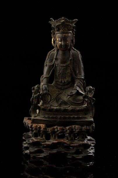 Déesse Guanyin entourée de deux attendants assise sur une rangée de fleurs de lotus en bronze à patine brune et traces de dorure. 17-18 ème siècle Présentée sur un socle en bois ajouré Haut.: 18 cm et avec socle 23 cm ajourée au bassin