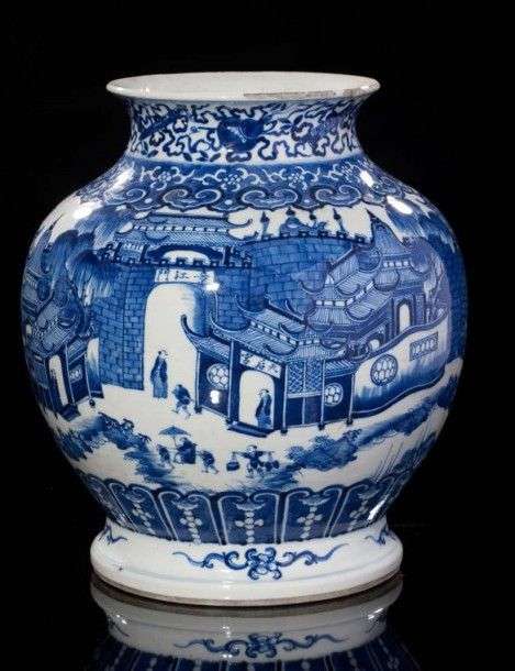 Vase balustre à large panse décoré en bleu sous couverte d'une scène lacustre animée de personnages avec palais, porte fortifiée, frise de ruyis et objets bouddhiques. Au revers marque kangxi à quatre caractères. Fin du 19ème siècle Haut.: 30 cm queqlues egrenures au col
