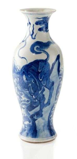 Petit vase balsutre décoré en bleu sous couverte de deux kilins perchés sur des rochers sur fond de vaguelettes. Nuages au col. Deuxième moitié du 19ème siècle Haut.: 26 cm