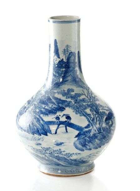 Vase bouteille décoré en bleu sous couverte d'un paysage lacustre avec pagodes, montagne, paysans traversant un pont et embarcations. Fin du 19ème siècle Haut.: 42 cm