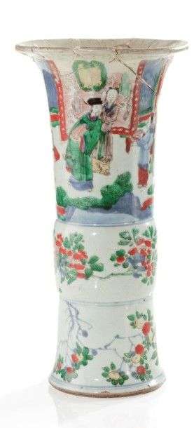 Vase cornet décoré en émaux wucaï de scènes de cour dans un jardin avec rocher percé, bananier, pêches de longévité. Période Transition, vers 1640 Haut.: 40 cm - accidents et nombreux manques au col