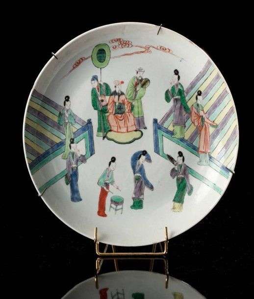 Coupe circulaire décoré en émaux de la famille verte d'une scène de palais avec orchestre de femmes et de danseuses. Porte au revers une marque Kangxi à six caractères en bleu sous couverte. 19ème siècle Diam.: 27.5 cm - une egrenure