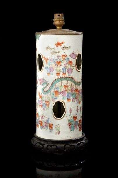 Vase rouleau ajouré décoré en émaux de la famille rose des cent enfants défilant avec dragons, poissons, lotus et lampions. Fin du XIXème Haut.: 27 cm monté en lampe au col et à la base