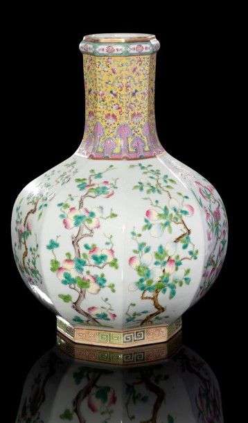 Grand vase octogonale de forme balsutre décoré en émaux de la famille rose de pêches de longévité alternées de grenades, kakis, citrons digités et quimquats sur la panse. Le col à fond jaune orné de fleurs de lotus et de feuillages stylisés. Au revers marque Qianlong en zhuangshou en rouge de fer. 20ème siècle Haut.: 45 cm