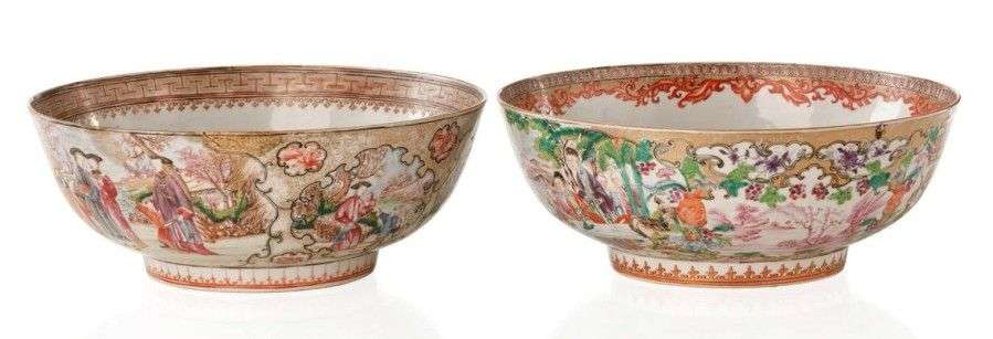 Paire de grands bols circulaires décorés en émaux de la famille rose de scènes représentant des mandarins et leur famille dans des paysages en réserves. Période Qianlong (1736-1795) Diam.: 28 et 29 cm un bol restauré et un avec cheveux