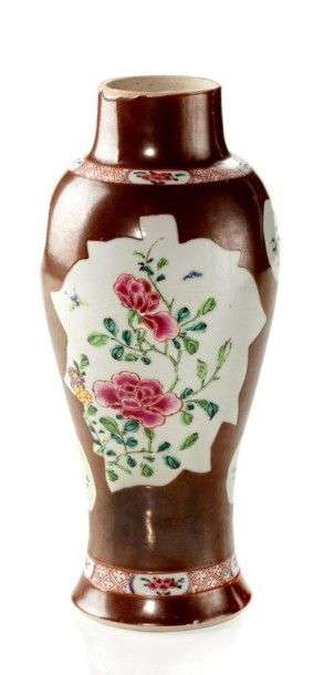 Petit vase balustre à fond capucin décoré en émaux de la famille rose de fleurs dans des réserves en forme de feuilles et de pêches. 18ème siècle Haut.: 22 cm - sans couvercle