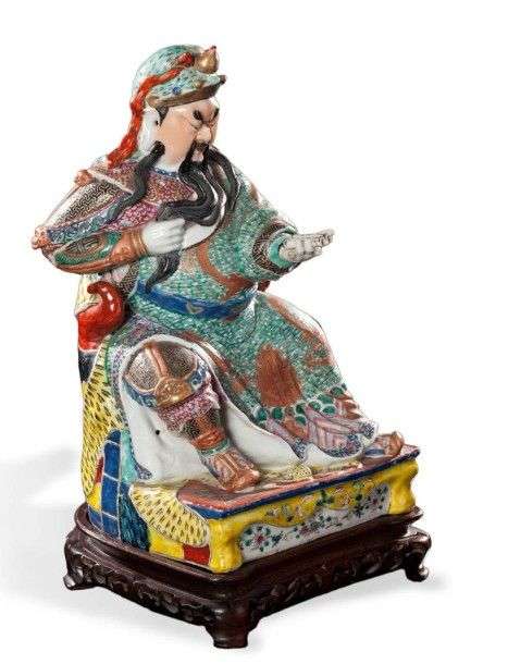 Grande figurine représentant le dieu Guandi assis sur son trône, une tortue à ses pieds et tenant un édit dans ses mains, décoré en polychromie. 20ème siècle Haut. totale: 47 cm