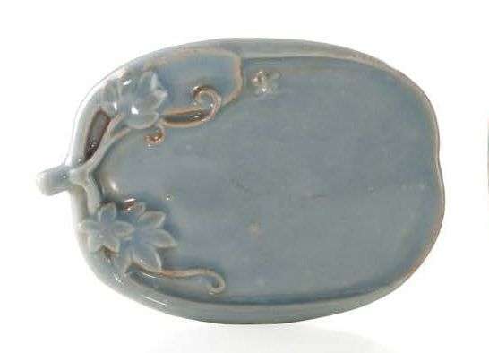 Objet de lettré en forme de feuille de lotus ovale à fond bleu lavande. Au revers marque Qianlong en zhuangshou Epoque République Long.: 9 cm