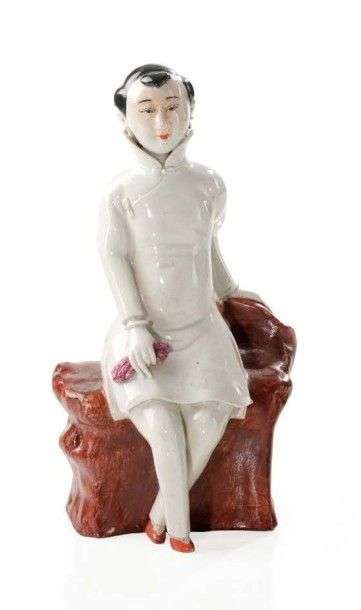 Figurine représentant une femme assise sur une souche d'arbre en robe blanche. Vers 1950 Haut.: 21 cm