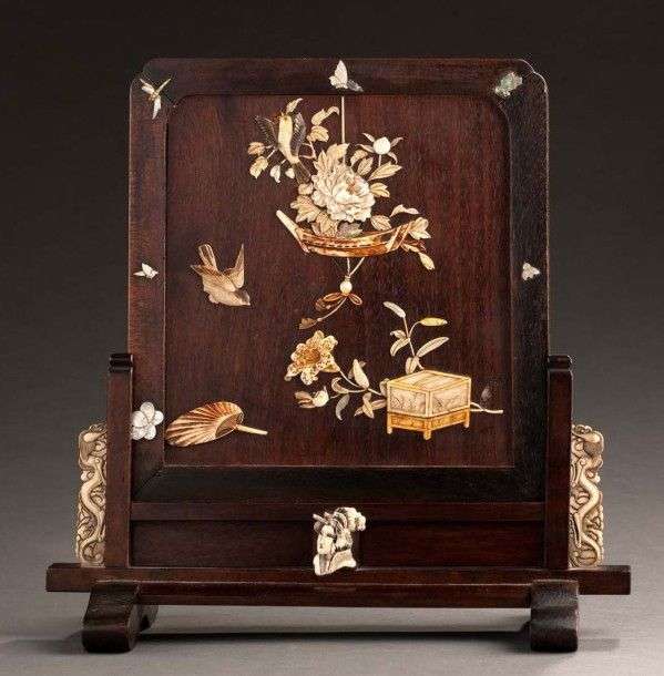Ecran de lettré en bois de forme carrée incrusté d'objets précieux (vase fleuri, eventail, boîte) en ivoire et nacre. Deuxième moitié du 19ème siècle Haut.: 34 cm - l'arrière transformé en miroir