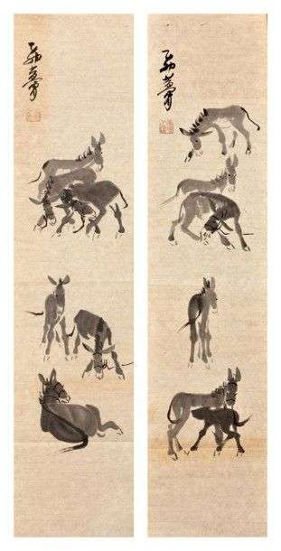 Paire de peintures sur papier représentant des anes. Signées et scellées Chine, 20ème siècle. Haut: 88 cm