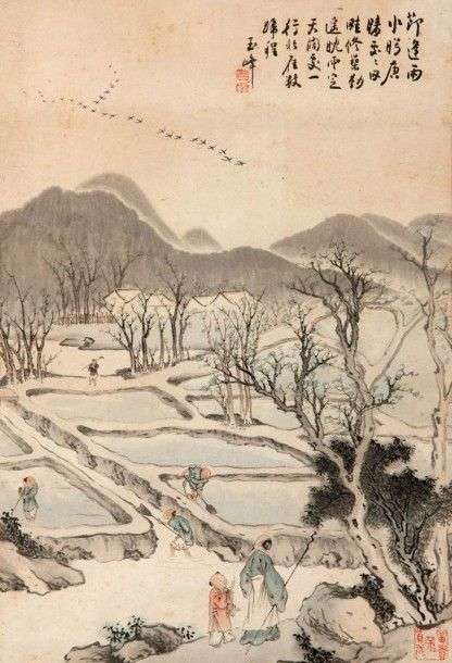 Suite de trois peintures sur papier représentant des paysans travaillant. poèmes et seaux. Chine, vers 1900 42 x 28,5 cm à vue Quelques pliures et taches