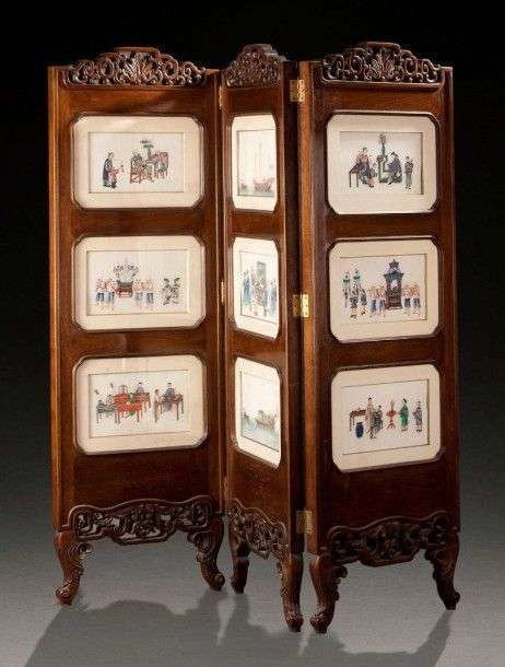 Paravent à trois feuilles en bois éxotique ajouré de rinceaux en partie haute et basse. Chaque feuille est décorée sur chaque face de trois gouaches sur papier de riz représentant des scènes d'intérieur animées de personnages, scènes maritimes... Vers 1900-1920 Dim. feuille: 159 x 52 cm Dim. papier: 17 x 29 cm quelques dechirures