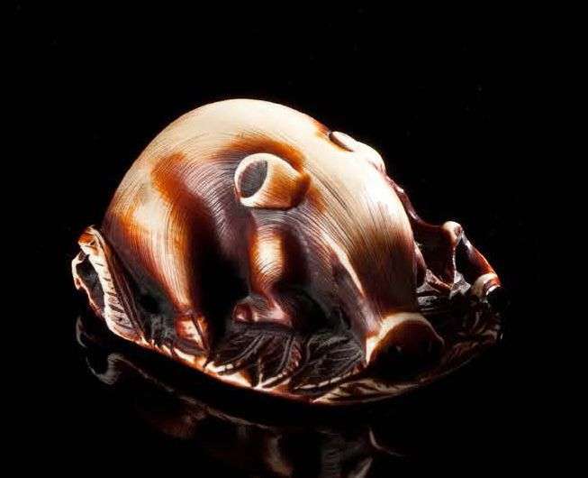 Netsuke en ivoire teinté| sanglier couché sur des feuilles. vers 1920-30 Long.: 5 cm