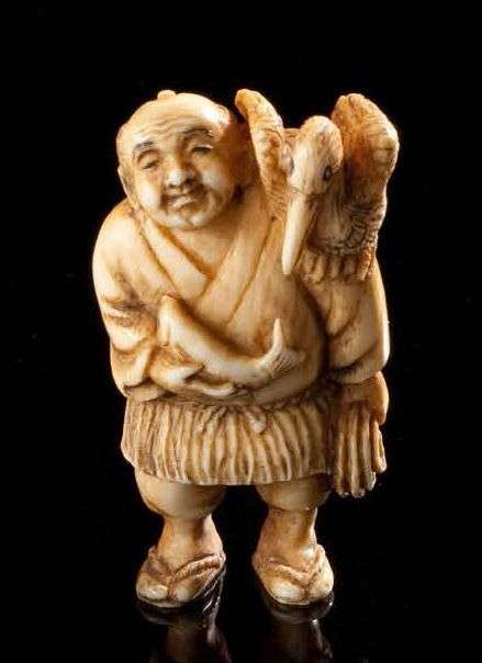 Netsuke en ivoire| pêcheur au cormoran. signé: Shô(?)raku. Vers 1930. Haut.: 5 cm