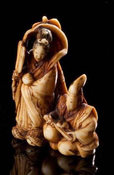 Netsuke en ivoire| noble assis, une femme debout à ses côtés tenant un éventail et un jeune serviteur se trouvant derrière elle fin du XIXème siècle Haut.: 4 cm