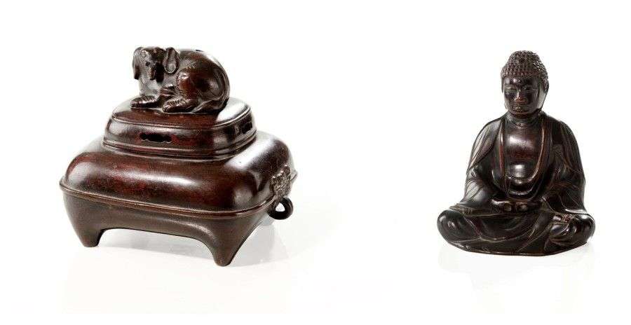 Brûle-parfum quadrangulaire reposant sur quatre pieds, le couvercle ajouré sommé d'un éléphant couché en bronze à patine brune. Marque à deux caractères au revers. On y joint une figurine en bronze à patine rouge et brune représentant un bouddha en position du lotus. Période Meiji Haut.: 12 et 17 cm