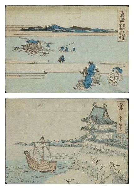 Deux petites estampes de la série Tokaïdo go ju san tsugi e zukushi dont Shimada est le 23ème relais et Miya le 41ème. Hokusaï a dessiné les 53 relais de cette voie notamment sous forme d'album et selon Richard Lane cet album daterait de 1810.
