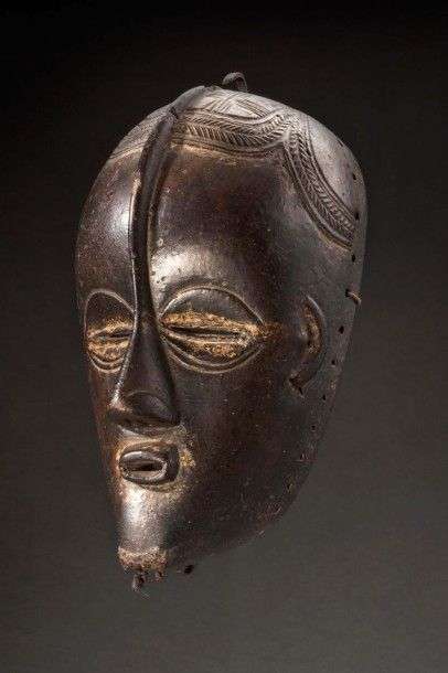 Masque Gouro-Bété-, Côte d'ivoire, provenant de la région Daloa, zone de culture du Cacao à l'extrême Ouest de la Côte d'Ivoire. Front bombé se terminant par un fer recourbé, coiffures finement ciselées sur le haut du front, scarifications frontales rejoignant la fine arête nasale, nez évasés, petites bouches entrouvertes, reste d'un colliers de barbe. Trâce de Kaolin autour des yeux, de la bouche et du front. Très belle patine d'usage Début XXème