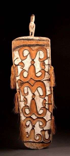 Bouclier Asmat, avec peintures végétales et minérales, représentant une superposition de motifs abtraits, l'ensemble surmonté d'un petit personnage. Collecté vers les année 70. H: 144 cm