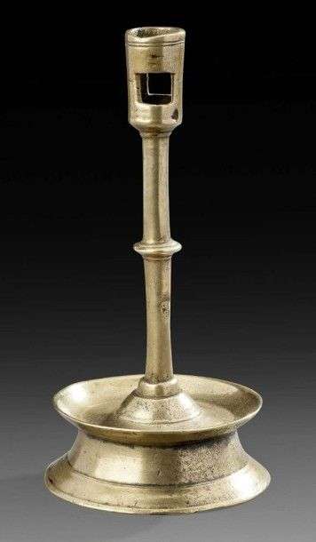 en bronze poli avec le pied en cloche à coupelle fut à noeud et bobèche ajourée