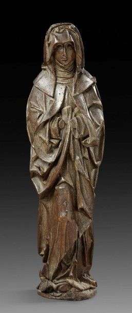 Cette sainte femme porte le voile et la mentonnière des veuves. Très hiératique dans la positon de son corps, elle est par contre très mouvementée dans la disposition de son manteau. Celui-ci s’ouvre devant et les pans se retournent au vent délimitant sur les cotés des plis polygonaux extrêmement creusés qui inciteraient à placer son élaboration dans la sphère germanique. Ce sera plutôt l’Est de la France à cause de sa physionomie.