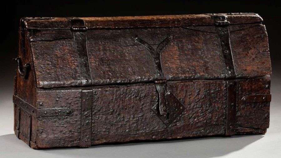 en bois de châtaignier à dessus en pantière bardé de fer forgé, ouvrant au rampant en façade fermé par une serrure à moraillon . Deux poignées de portage au côtés