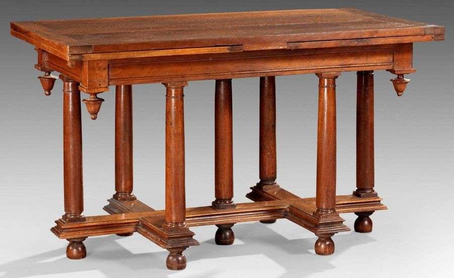 à piétement en croix de Lorraine reposant sur sept colonnes baguées et renflées. Ceinture moulurée à quatre toupies en chute, plateau à tirettes latérales. Entretoise moulurée reposant sur des pieds en demi-boulle.
