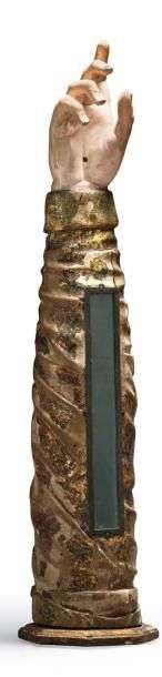Polychromie fragmentaire et ne contient plus de relique. Le bras est représenté ici dressé, raide, seuls les doigts de la main évoquent le mouvement. Le bras proprement dit est recouvert partiellement d'une polychromie dorée qui devait être d'une grande richesse. Une petite vitre ceinte de métal se trouvant le long du bras laissait apparaître à l'origine les reliques du Saint.