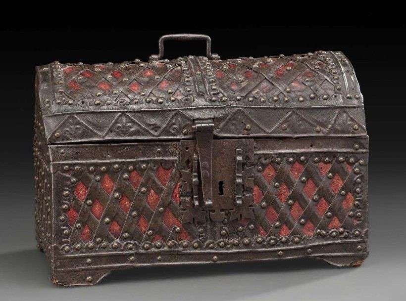 en bois garnit de cuir rouge et croisillons de fer estampé, très belle serrure à morallion et petite poignée de portage