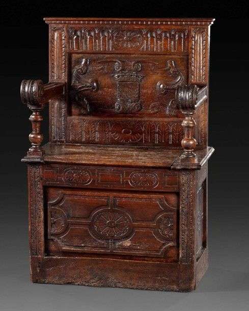 accotoirs droits à enroulement sur console en balustre, le dossier orné d'un cartouche aux armes, le siège ouvrant à abattant orné en façade de motifs géométriques à roses .