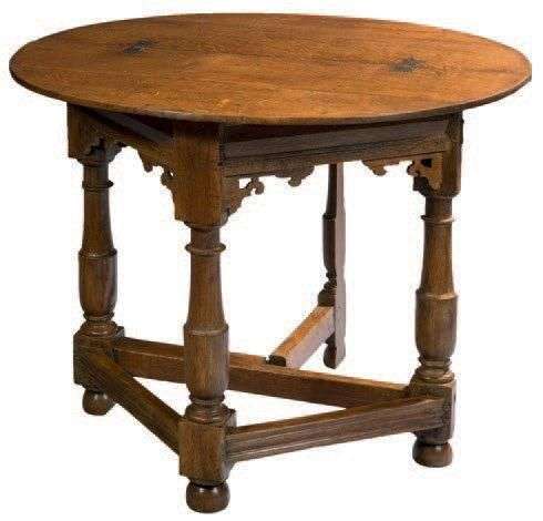 La table demi-lune propose deux positions. Trois pieds supportent le plateau replié, semi circulaire : elle est alors table d’applique. L’un des pieds se dédouble, coupé en son milieu. Ouvert, il accueille le volet rabattu. La table, devenue circulaire, est meuble de milieu. De petites pentures à fleur articulent les deux plateaux. Des moulures creusent les traverses d’entretoise et de ceinture, celle-ci consolidée par de petits goussets ajourés, typiques des Flandres. Les pieds balustres adoptent les formes en vogue dans la première moitié du dix septième siècle, alliant l’élégance à la solidité
