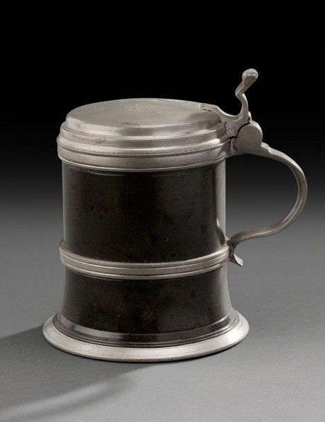 en serpentine vert veinée avec monture en étain au poinçon de Nuremberg. Poucier du couvercle en forme de coquille.