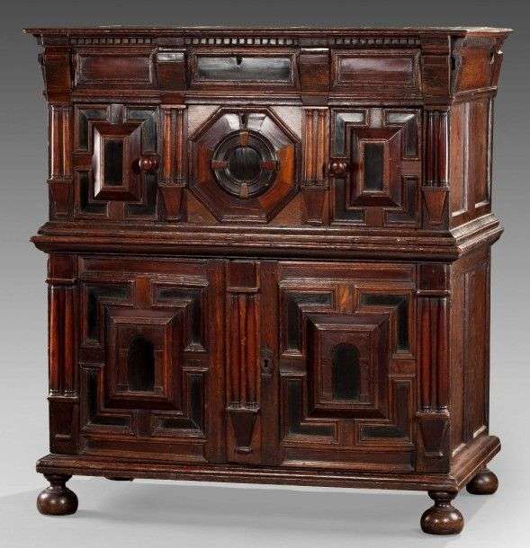 en bois de chêne panneautés et mouluré ouvrant dans la partie supérieure à deux tiroirs et dans la partie inférieure à deux portes ouvrant sur une série de tiroirs. Ornés en façade de caissons moulurés et placage d’ébène à denticules . Le tout reposant sur des pieds raves .