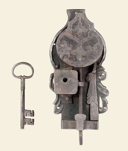en fer forgé. Platine en fer découpé et repoussé de branchages et de motifs de fleurs finement gravés à l'acide.