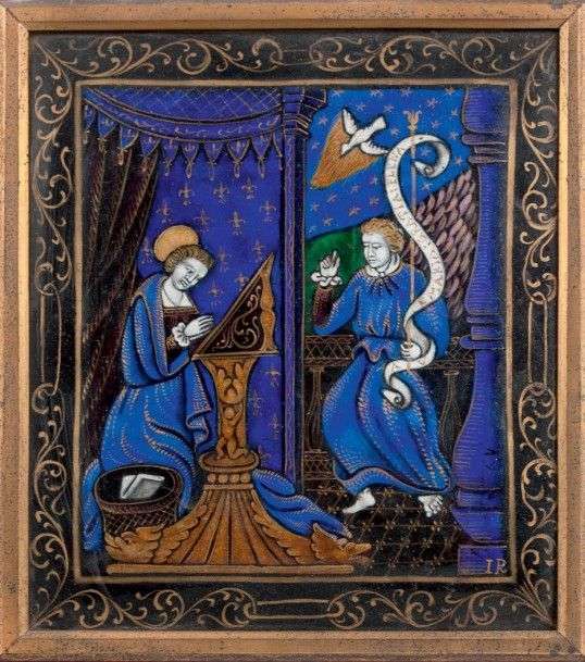 Plaque d'émail peint sur cuivre sur un fond bleu fleurs de lys, encadré de rinceaux sur fond noir, monogramme IR en bas à droite. Dans un encadrement de velours rouge usé.