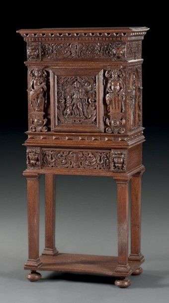 en bois de chêne mouluré et sculpté ouvrant en façade à une porte ornée d'une charité encadrée de pilastre à termes allégoriques. Les côtés ornés d'allégories dans les arcatures à rinceaux.