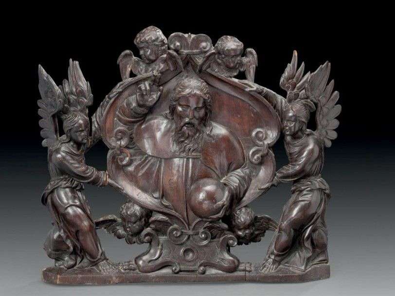 Groupe en bois naturel sculpté en haut relief ajouré présentant Dieu le Père dans un cartouche soutenu par deux anges, Dieu le Père présenté à mi-corps, la main droite relevée bénissant et la main gauche soutenant l'orbe.
