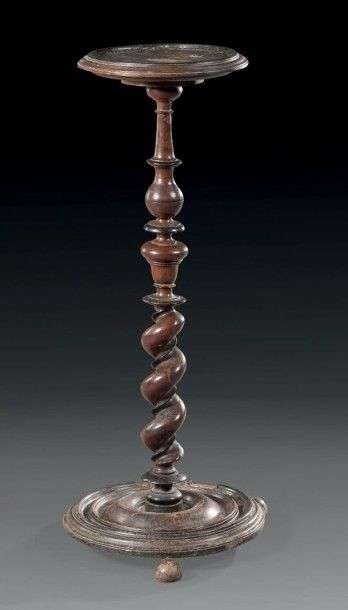 Accidents -base lestée d'un plomb et plateau monté sur pivot.Ce type de sellette était fréquemment utilisé sous le règne de Louis XIII. Elles se déplaçaient aisément et servaient à y déposer des chandeliers, voire des cages à oiseaux.