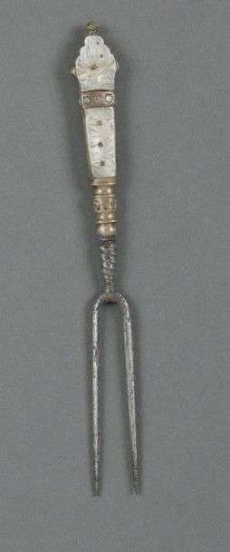 en acier, le manche en nacre et laiton à l'extrémité lancéolée