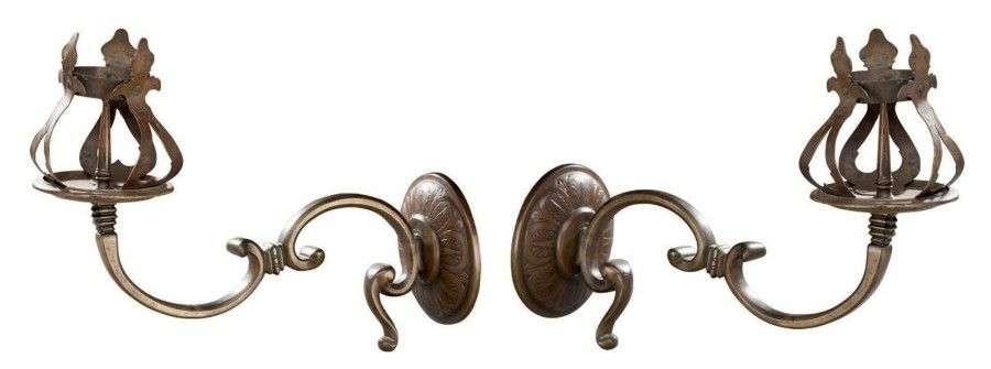 Les deux bras en S terminés par des coupelles à piques munies de couronnes ajourées prennent appui contre des platines murales en dômes finement gravées de feuilles.