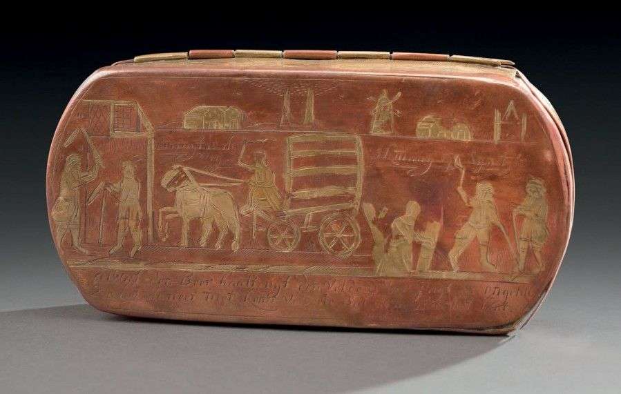 en cuivre rouge partiellement doré, fermé par une serrure à combinaisons, présentant sur ses deux faces des scènes agricoles et inscriptions en vieux flamand.
