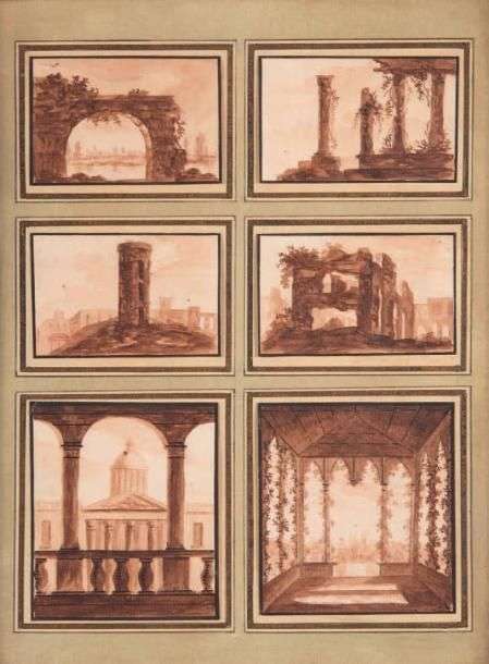 Divers paysages et ruines Six dessins sur le même montage Plume et encre brune. 5 x 8,5 cm (4) et 9 x 8,5 cm (2)