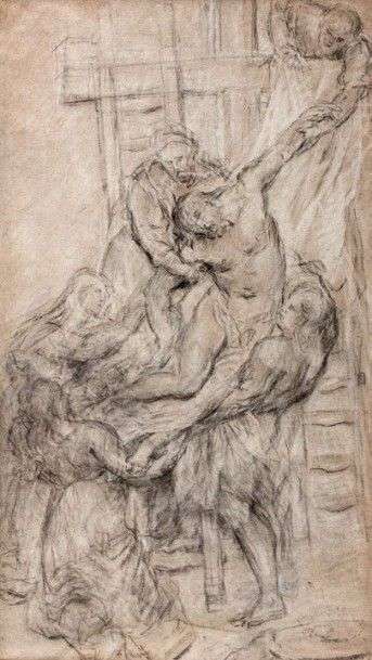 La déposition du Christ Pierre noire et rehauts de blanc sur papier bleu Mouillures Cette composition s'inspire de la partie centrale du triptyque de la cathédrale d'Anvers par Pierre Paul Rubens réalisé en 1612-1614. 51,5 x 29 cm